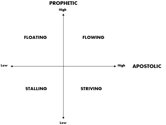 High prophetic (UP) and high apostolic (OUT) feels like flowing: the church is hitting on all cylinders in the power of the Spirit. God’s presence is evident. There is deep and sustained practice in prayer. People are coming to the Lord. New missional communities are being started.